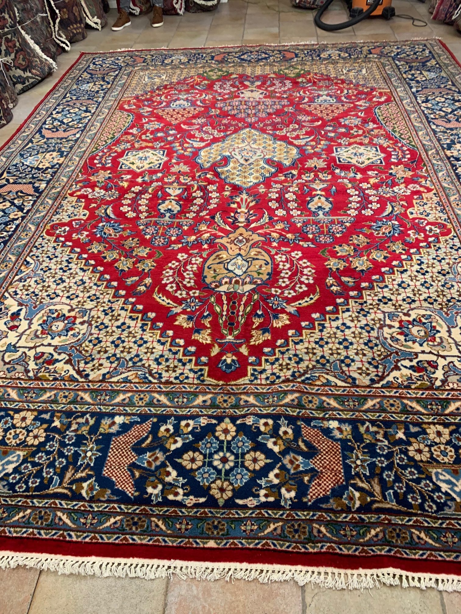 The rug pattern is like a Dimond Shape in the middle with a Red color with a navy blue border and a beige color in 4 corners.