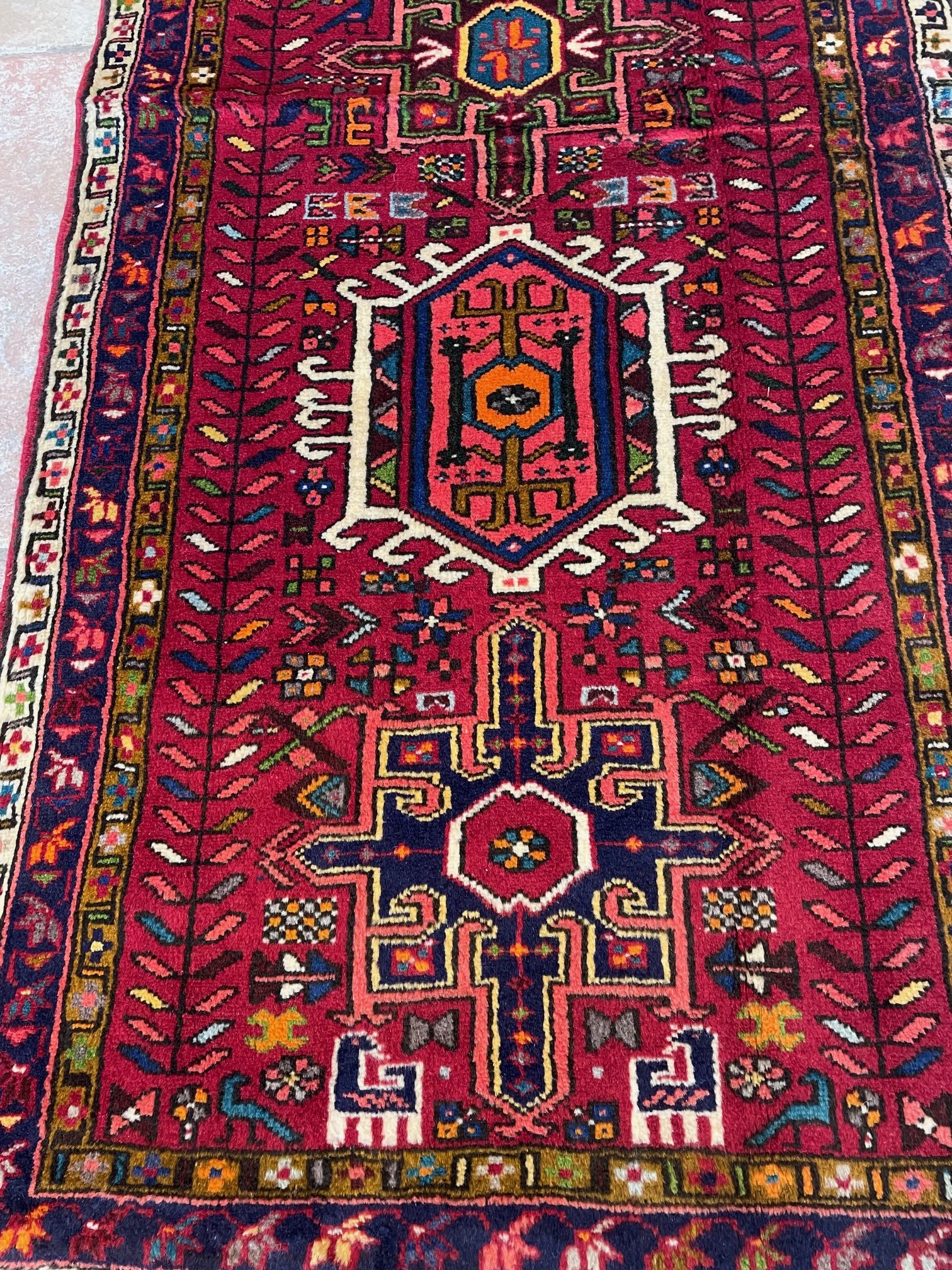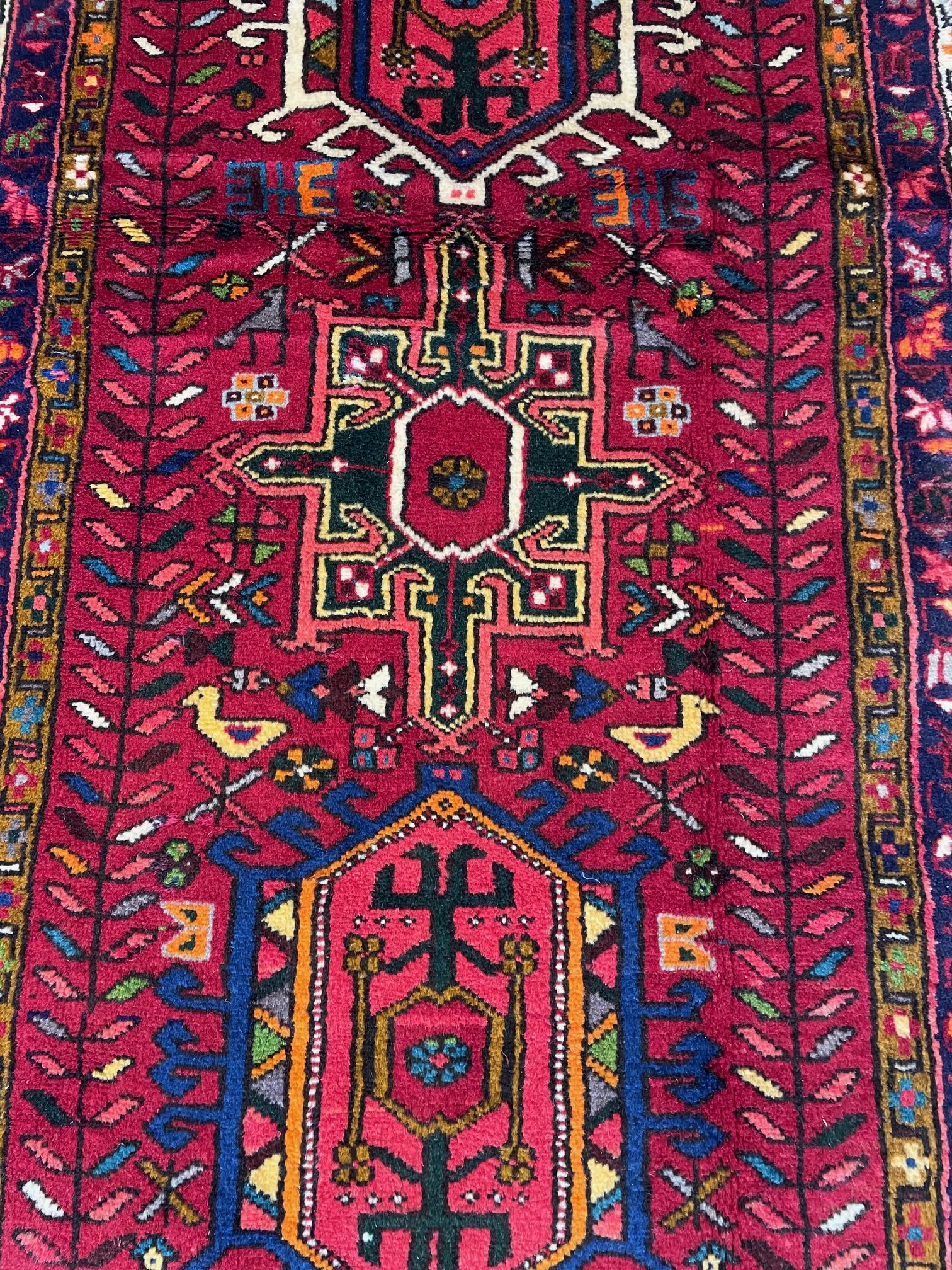 Heriz rug weavers often make them in geometric, bold patterns with a large medallion dominating the field. Such designs are traditional and often woven from memory.