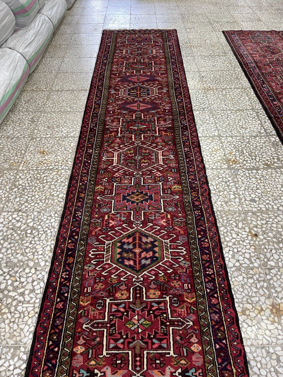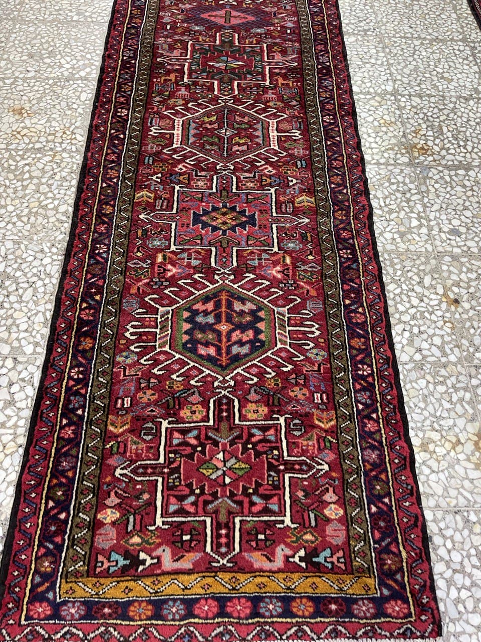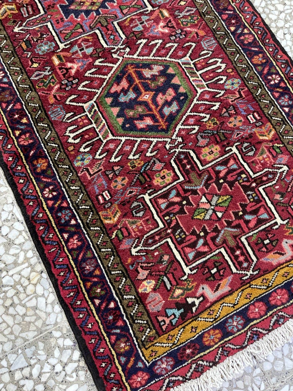 Heriz rug weavers often make them in geometric, bold patterns with a large medallion dominating the field. Such designs are traditional and often woven from memory.